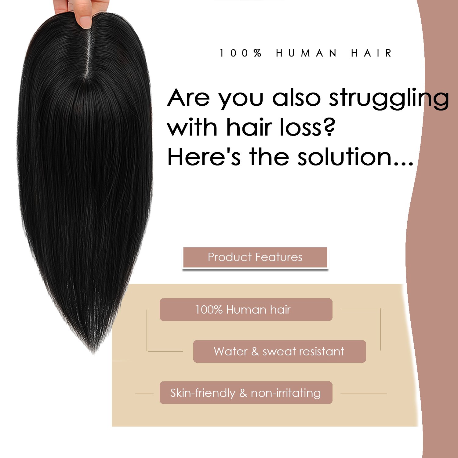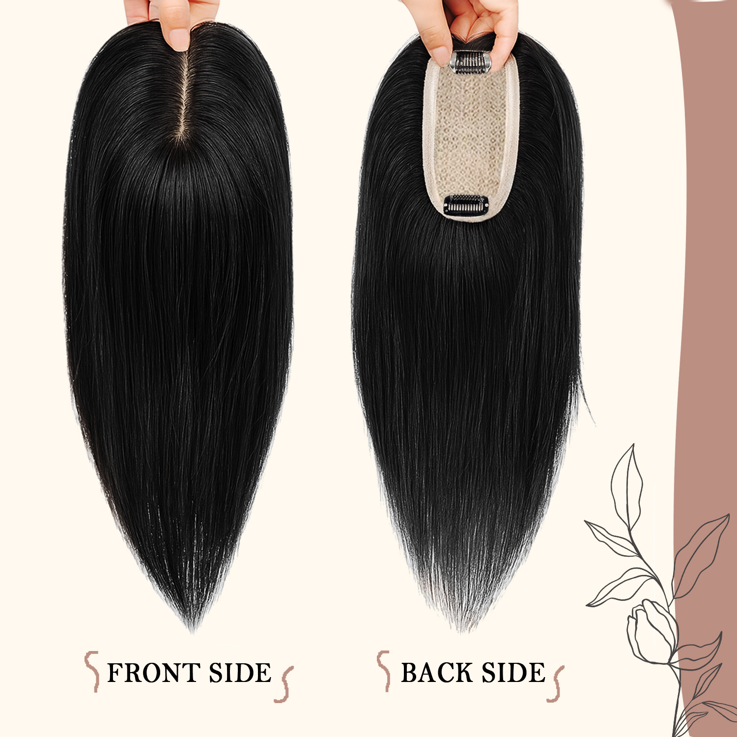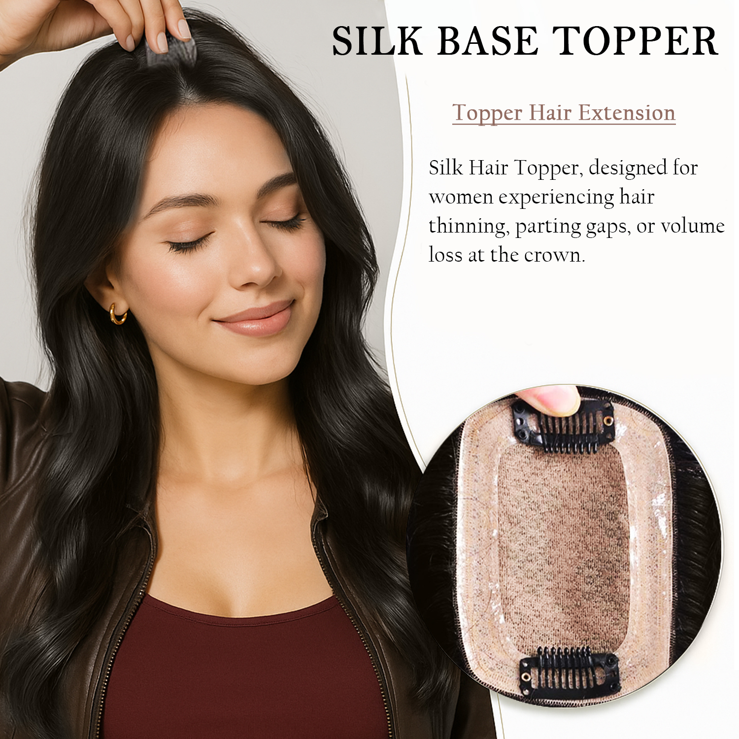 2×3 silk base real human hair topper in natural black—soft, smooth, realistic scalp appearance, natural-looking parting, and perfect for thinning crown or hair loss coverage.
